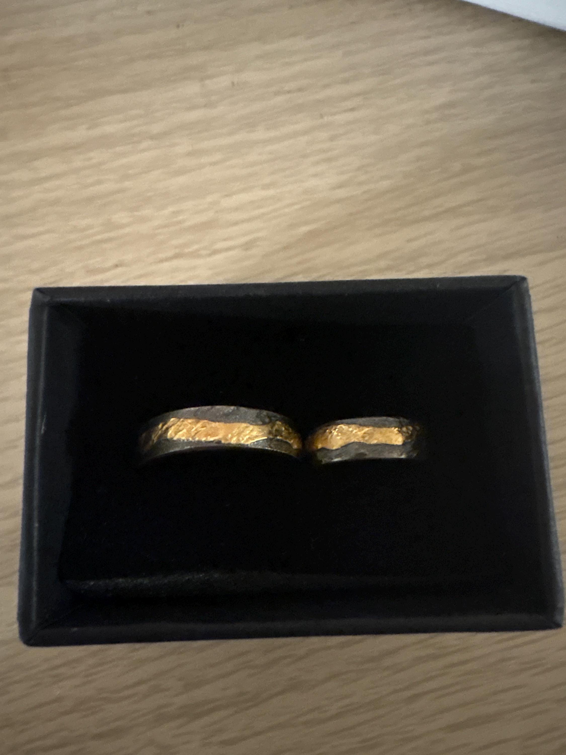 Einzigartige geschwärzte Trauringe mit Hammerschlag & einem goldenem Lebensfluss